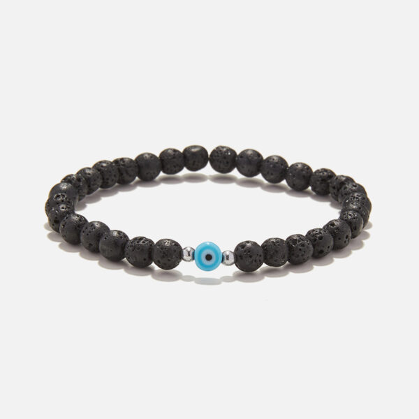 Ανδρικό χειροποίητο πολύσειρο βραχιόλι με φυσικές ορυκτές πέτρες από μαύρη λάβα (0.6 cm), γυαλιστερή ροδέλα αιματίτη (0.4 cm), πλεκτό μαύρο – τιρκουάζ μακραμέ και ατσάλινο στοιχείο “ψαράκι” στη μέση. Κατασκευή με κορδόνι και δέσιμο μακραμέ.